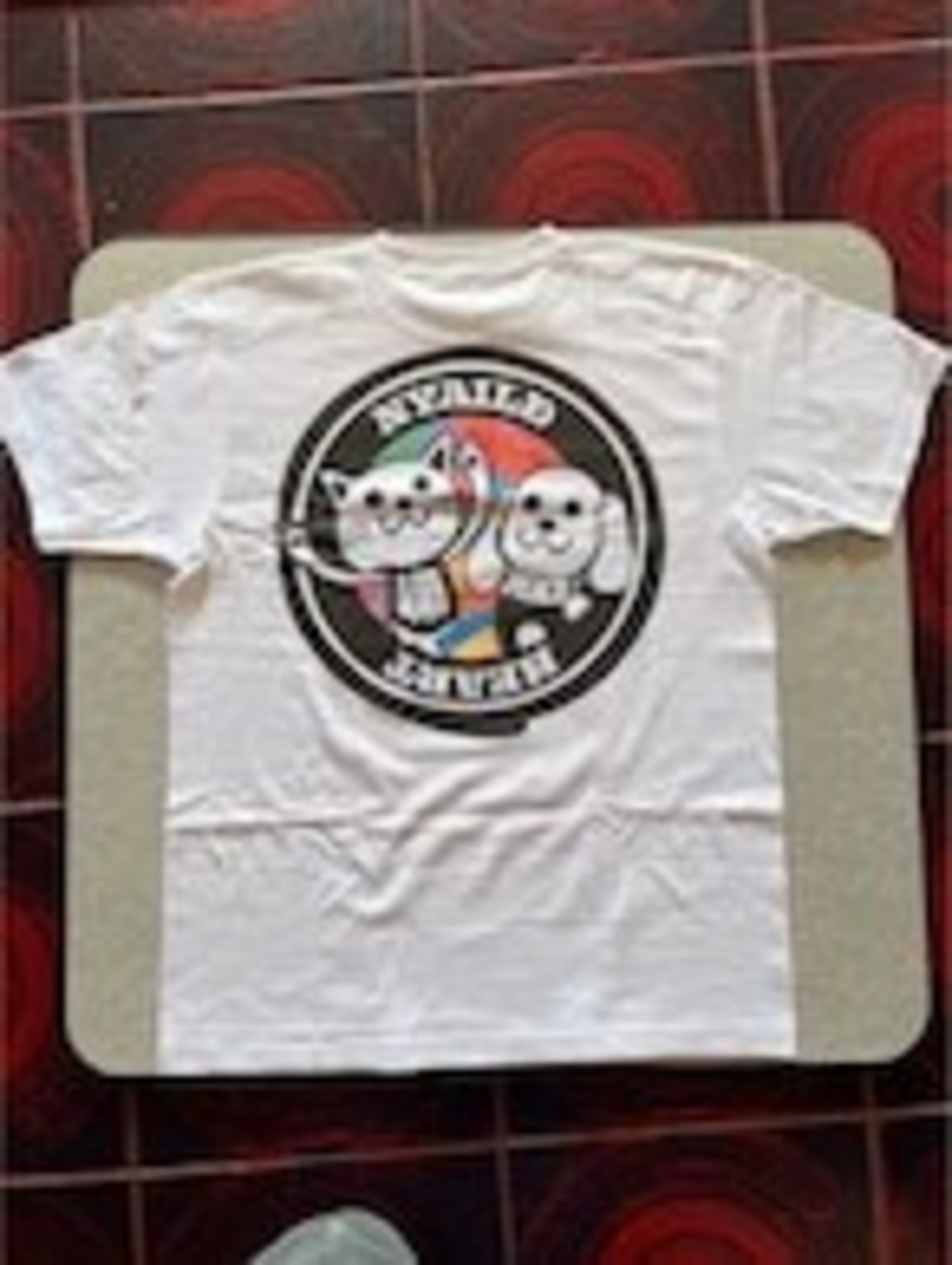 ②Tシャツ(表面:オリジナルデザイン、背面:にゃいるどはーとロゴ)